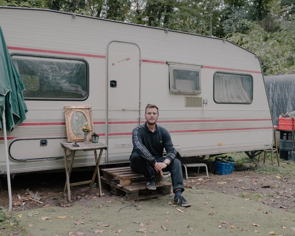 Marten Reiß 41 am Tagebau Garzweiler vor dem gelben X dem Symbol der Klimaschutzbewegung. Linksradikale Berufsdemonstranten besetzen ein verlassenes Dorf im Braunkohletagebau.